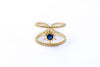 Anillo para mujer con diseño de doble sol y zirconia central de color, elaborado en chapa de oro. Llamativo y elegante.